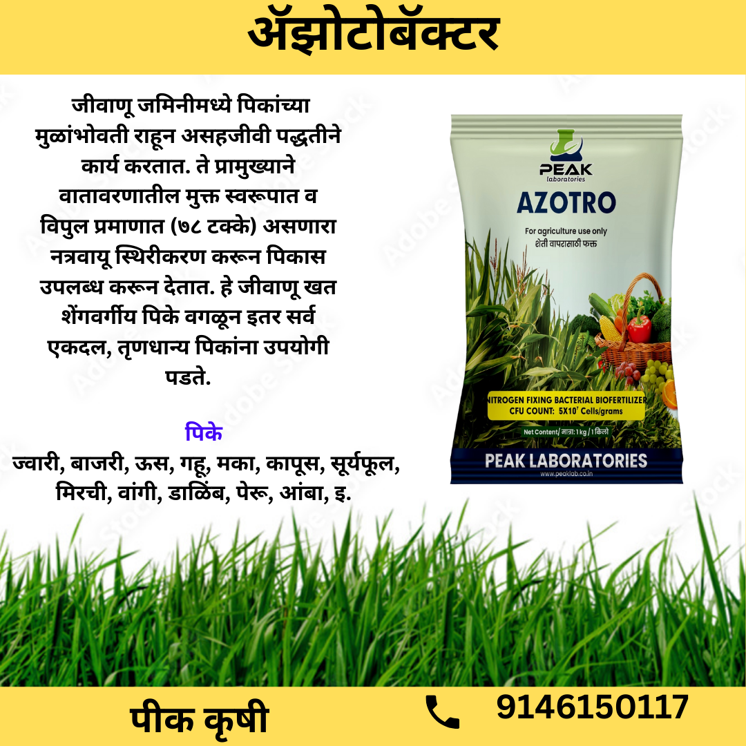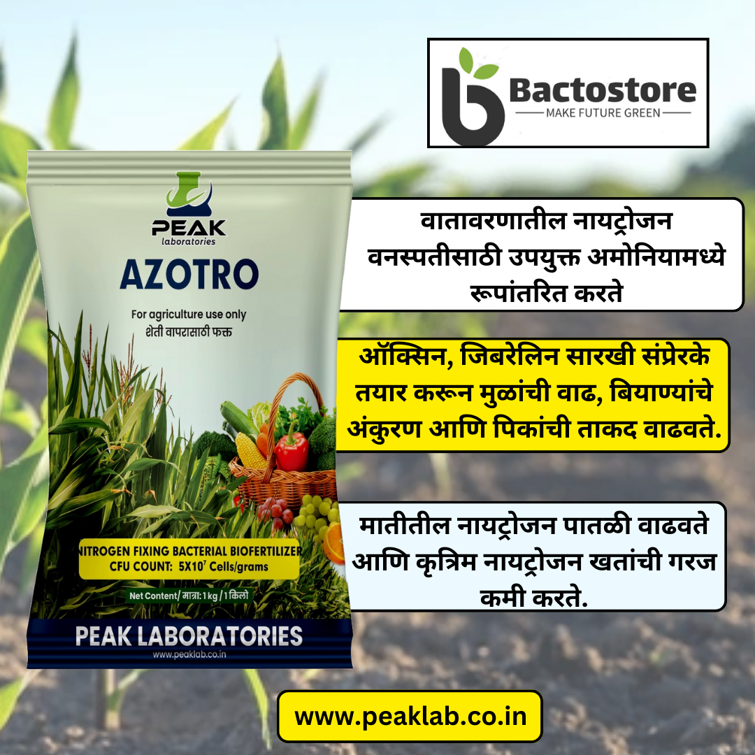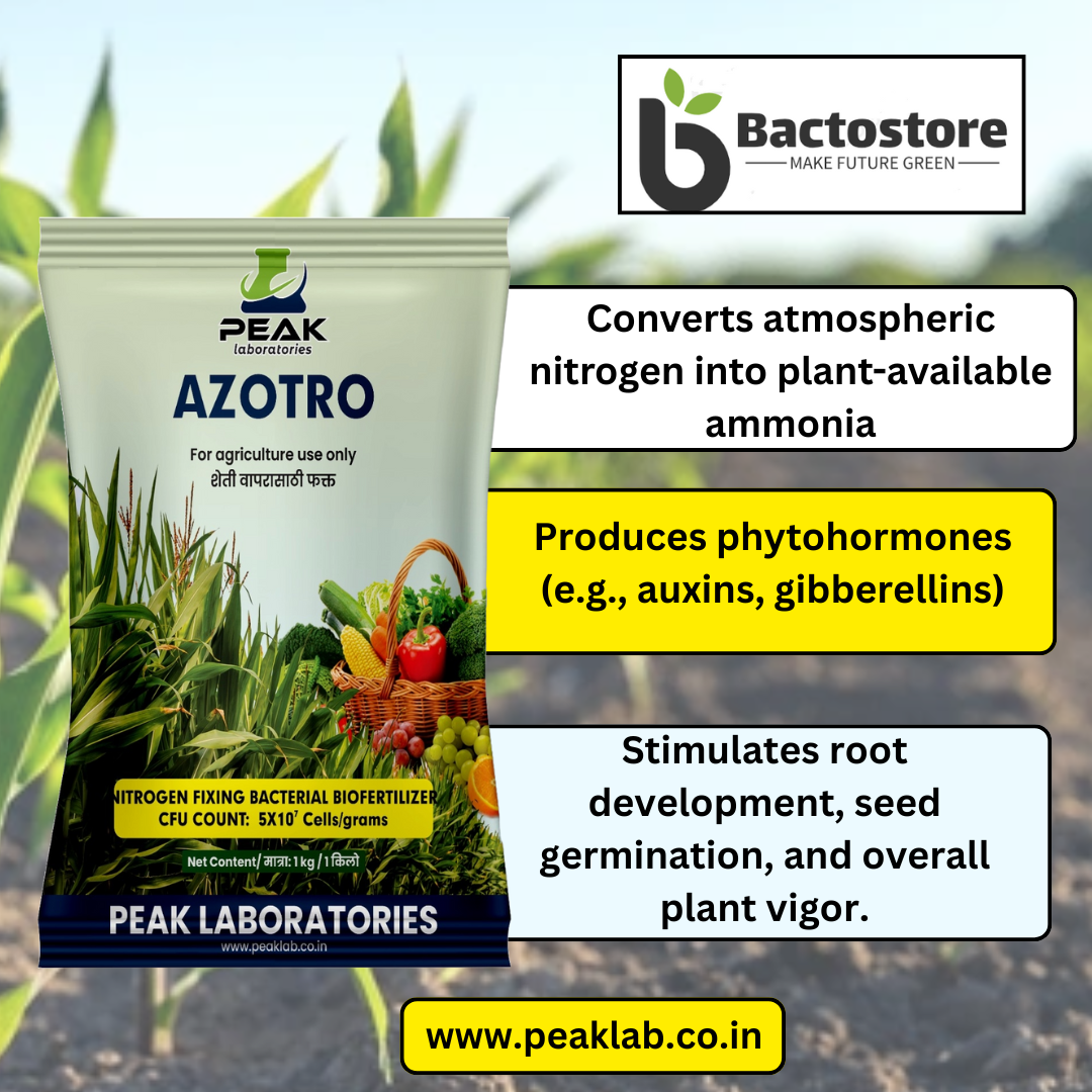 Azotro Comprised of free living nitrogen fixing bacteria Azotobacter sp. (5×107 cell/gm) Fixes nitrogen. Application of Azotobacter in crops considerably reduces the input of chemical nitrogen fertilizer. Azotro also helps to improve seed germination and disease resistance by synthesizing active compounds, thus seed and seedling treatment. This biofertilizer is a sustainable and eco-friendly alternative to nitrogenous chemical fertilizers.