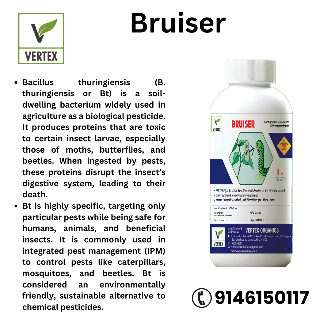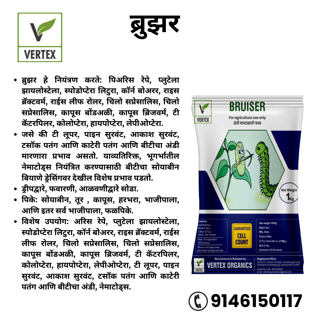 • ब्रुझर हे नियंत्रण करते: पिअरिस रेपे, प्लुटेला झायलोस्टेला, स्पोडोप्टेरा लिटुरा, कॉर्न बोअरर, राइस ब्रॅक्टवर्म, राईस लीफ रोलर, चिलो सप्रेसालिस, चिलो सप्रेसालिस, कापूस बोंडअळी, कापूस ब्रिजवर्म, टी कॅटरपिलर, कोलोप्टेरा, हायपोप्टेरा, लेपीओप्टेरा.