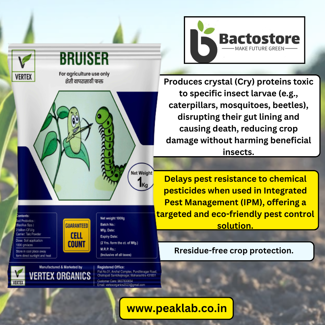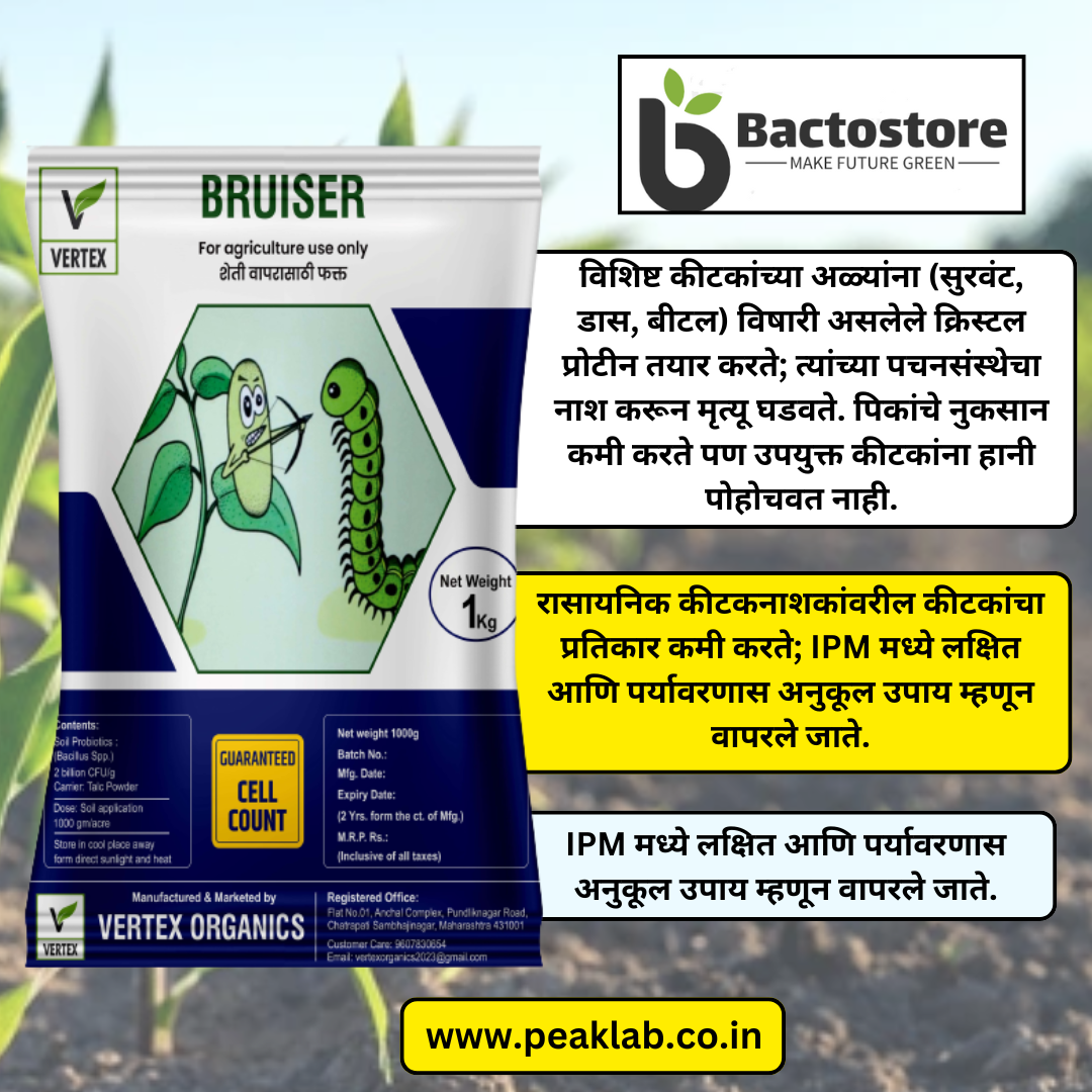 • विशेष उपयोग: अरिस रेपे, प्लुटेला झायलोस्टेला, स्पोडोप्टेरा लिटुरा, कॉर्न बोअरर, राइस ब्रॅक्टवर्म, राईस लीफ रोलर, चिलो सप्रेसालिस, चिलो सप्रेसालिस, कापूस बोंडअळी, कापूस ब्रिजवर्म, टी कॅटरपिलर, कोलोप्टेरा, हायपोप्टेरा, लेपीओप्टेरा, टी लूपर, पाइन सुरवंट, आकाश सुरवंट, टसॉक पतंग आणि काटेरी पतंग आणि बीटीचा अंडी, नेमाटोड्स.