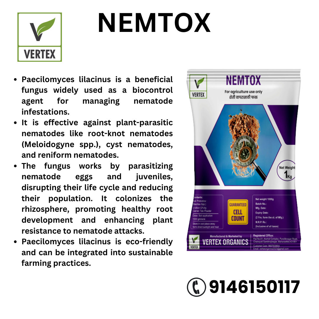 NEMTOX (Paecilomyces lilocinus) is genus of nematophagous fungus which kills harmful nematodes by pathogenesis causing disease in the nematodes. Therefore the fungus can be used as a bio-nematicide to control nematodes by applying it to the soil.Benefits