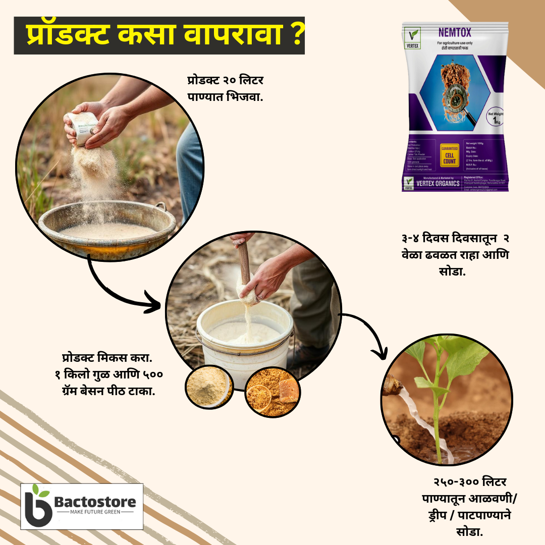 •    नेमटोक्स हे एक नेमाटोड्सचे नैसर्गिक विरोधी वंशाचा असून याचा उपयोग नेमाटोड नियंत्रणासाठी केला जातो. हे रूट नॉट नेमाटोड, रेनिफॉर्म नेमाटोड, सायट्रस नेमाटोड यांच्या व्यवस्थापनासाठी उपयुक्त बायो-नेमॅटिकाइड आहे.