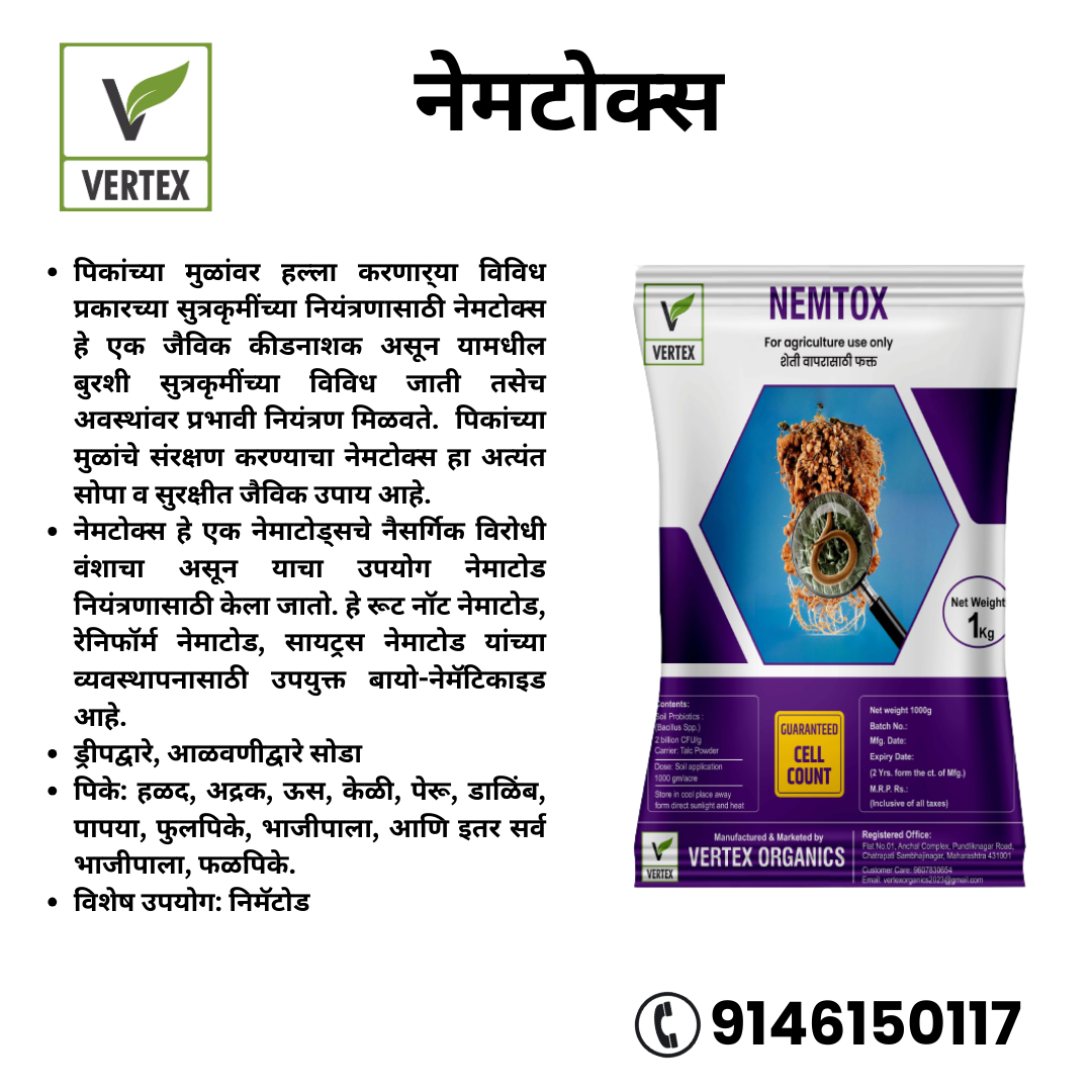 • पिकांच्या मुळांवर हल्ला करणार्या विविध प्रकारच्या सुत्रकृमींच्या नियंत्रणासाठी नेमटोक्स हे एक जैविक कीडनाशक असून यामधील बुरशी सुत्रकृमींच्या विविध जाती तसेच अवस्थांवर प्रभावी नियंत्रण मिळवते.  पिकांच्या मुळांचे संरक्षण करण्याचा नेमटोक्स हा अत्यंत सोपा व सुरक्षीत जैविक उपाय आहे.