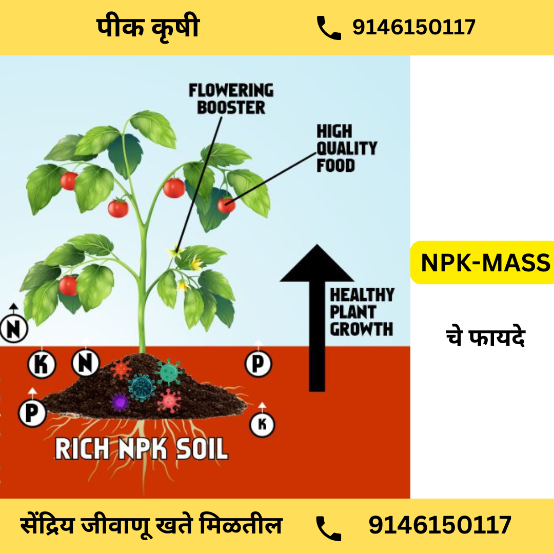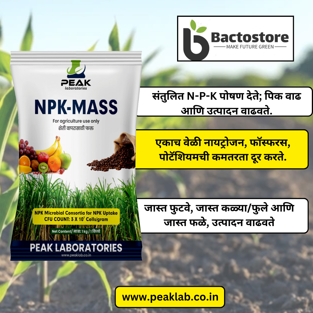 •    NPK-MASS (NPK Consortia 3 x107 cell/gm) मध्ये विविध फायदेशीर सूक्ष्मजीवांचा समावेश आहे. यामध्ये फॉस्फेट विद्राव्य आणि पोटॅश मोबिलायझर्सच्या संयोगाने नायट्रोजन फिक्सिंग बॅक्टेरियाचा समावेश होतो.