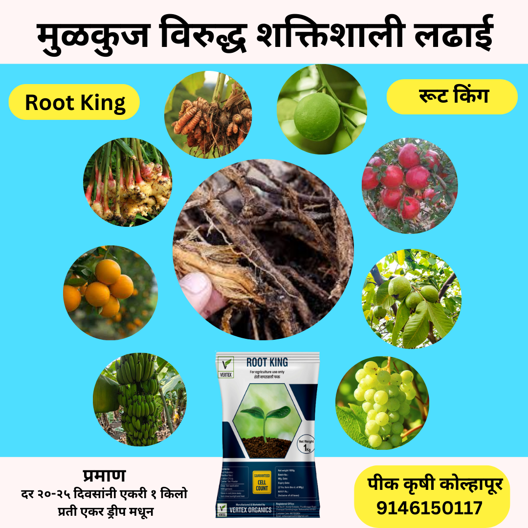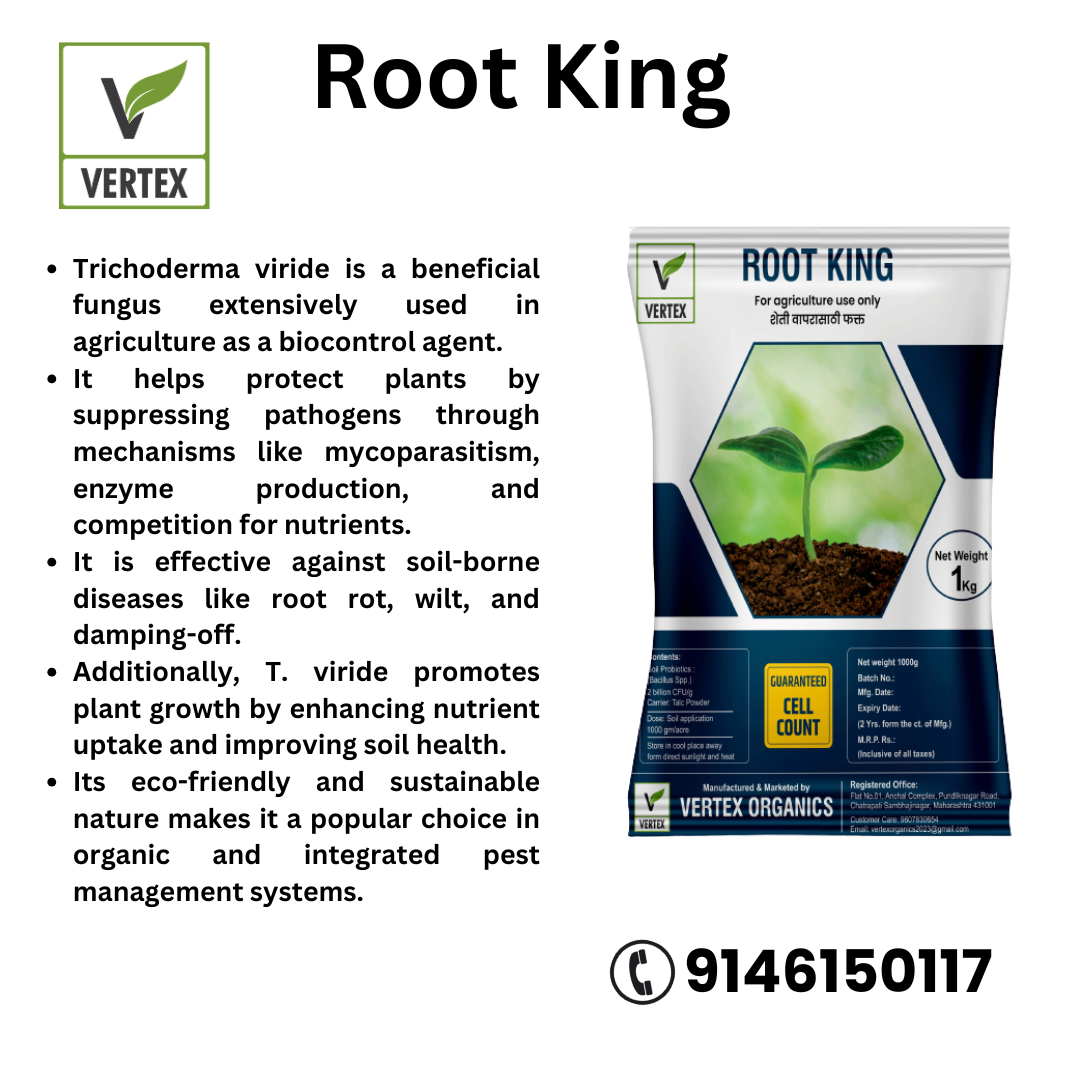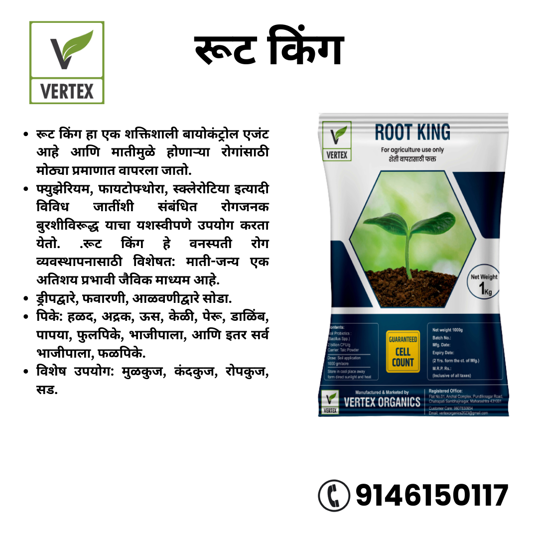 •    रूट किंग (Trichoderma 2X108 cell/gm) हा एक शक्तिशाली बायोकंट्रोल एजंट आहे आणि मातीमुळे होणाऱ्या रोगांसाठी मोठ्या प्रमाणात वापरला जातो.