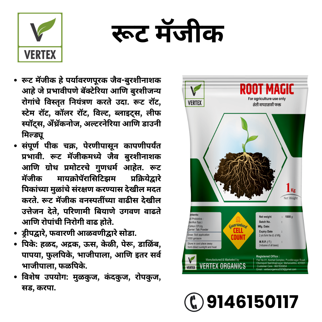 - ROOT MAGIC contains properties of Bio Fungicide and Growth Promoter.