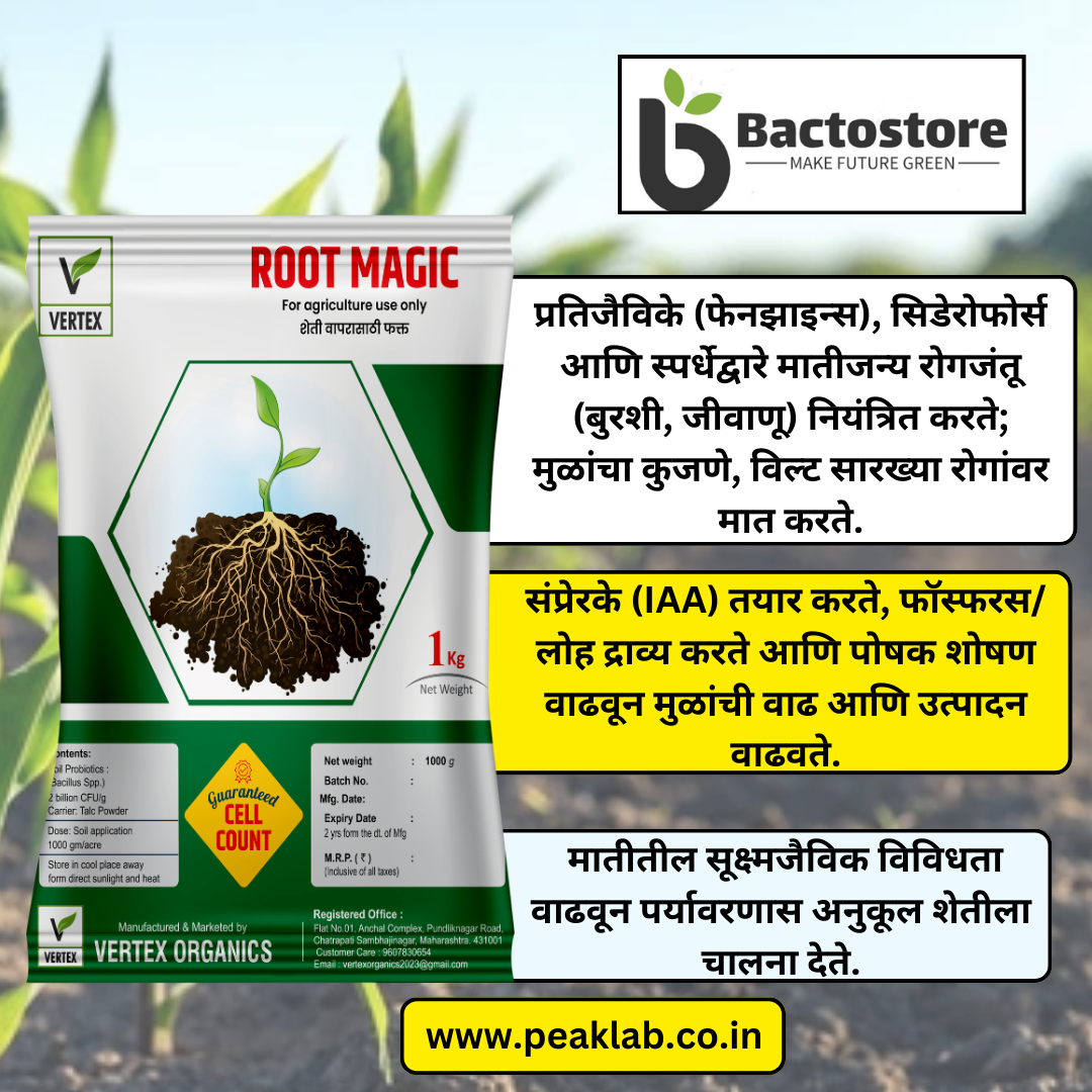 • रूट मॅजीक हे पर्यावरणपूरक जैव-बुरशीनाशक आहे जे प्रभावीपणे बॅक्टेरिया आणि बुरशीजन्य रोगांचे विस्तृत नियंत्रण करते उदा. रूट रॉट, स्टेम रॉट, कॉलर रॉट, विल्ट, ब्लाइट्स, लीफ स्पॉट्स, अँथ्रॅकनोज, अल्टरनेरिया आणि डाउनी मिल्ड्यू