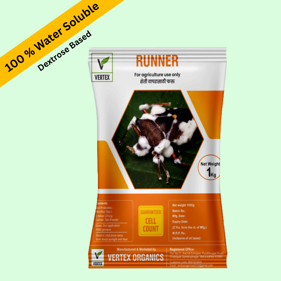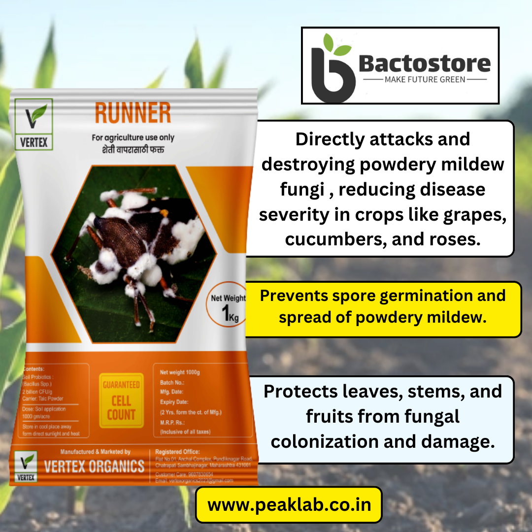 • रनर हे पावडर बुरशीचे नैसर्गिकरित्या उद्भवणारे बुरशीजन्य परजीवी आहे. हे पावडर बुरशीसाठी प्रभावी उपाय आहे तसेच बोट्रिटिस सिनेरिया, अल्टरनेरिया सोलानी, कोलेटोट्रिचम, कोकोड्स आणि क्लॅडोस्पोरियम क्यूमेरीनम वरील परजीवी देखील आहे.