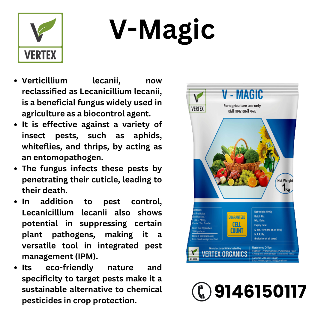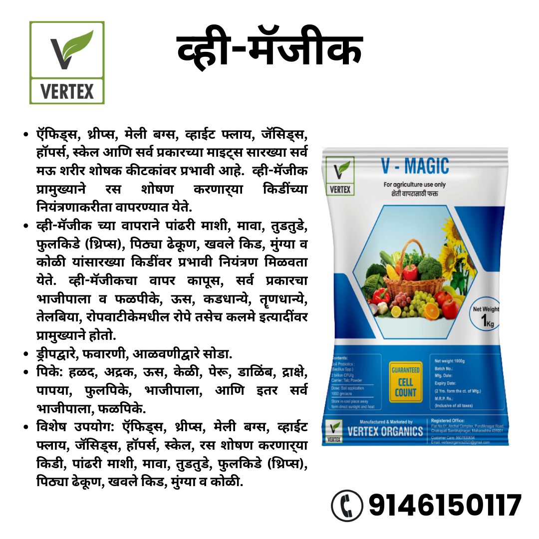 • ऍफिड्स, थ्रीप्स, मेली बग्स, व्हाईट फ्लाय, जॅसिड्स, हॉपर्स, स्केल आणि सर्व प्रकारच्या माइट्स सारख्या सर्व मऊ शरीर शोषक कीटकांवर प्रभावी आहे. व्ही-मॅजीक प्रामुख्याने रस शोषण करणार्या किडींच्या नियंत्रणाकरीता वापरण्यात येते.