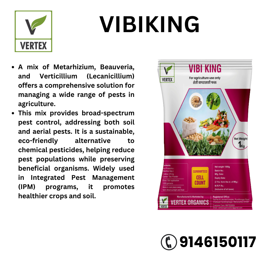 • VIBIKING is a new unique combination of 3 Bio Pesticides Verticillium Lecanii + Beauveria Bassiana + Metarhizium Anisopliae that occur naturally in soils throughout the world – the combination gives excellent bio – insecticide control.