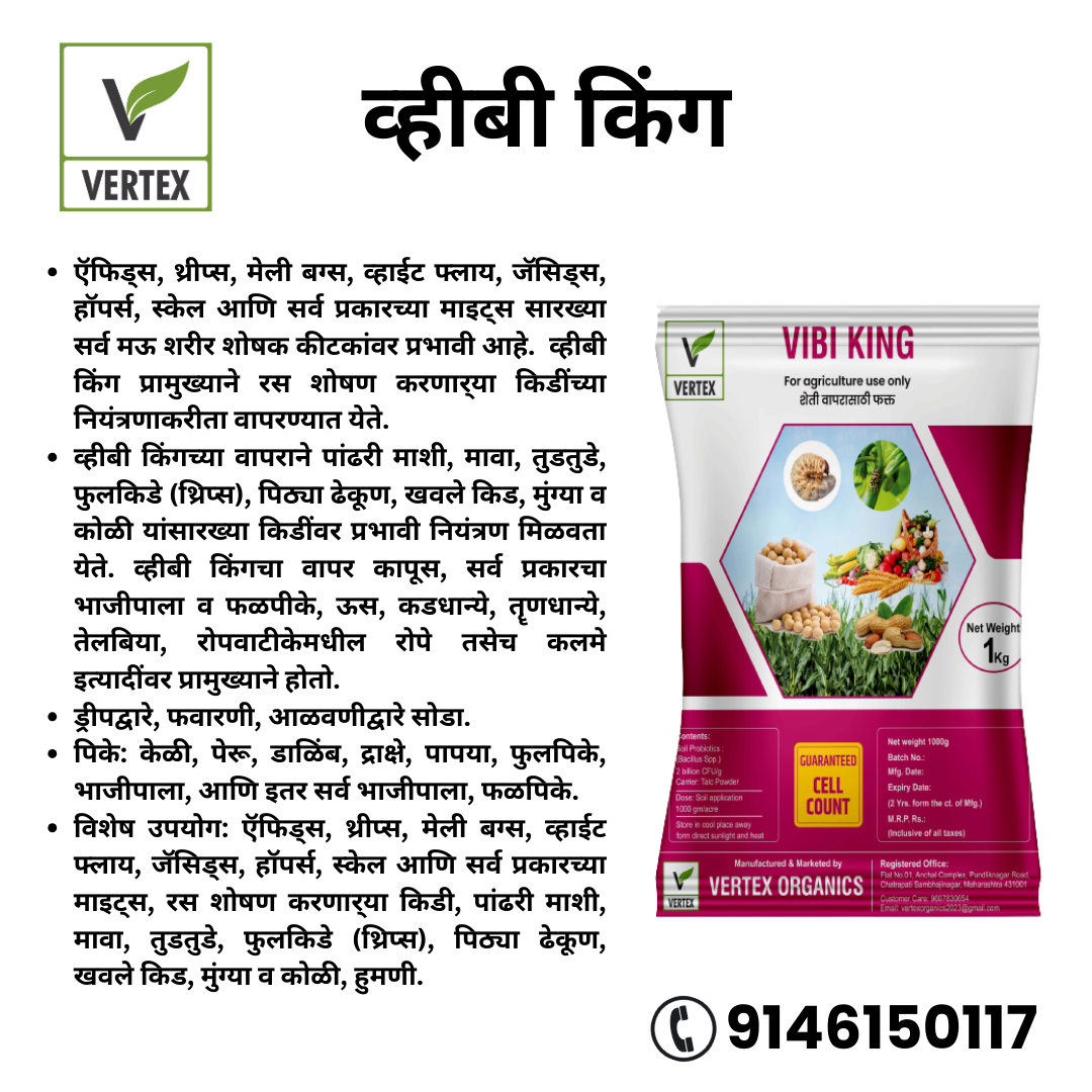 • ऍफिड्स, थ्रीप्स, मेली बग्स, व्हाईट फ्लाय, जॅसिड्स, हॉपर्स, स्केल आणि सर्व प्रकारच्या माइट्स सारख्या सर्व मऊ शरीर शोषक कीटकांवर प्रभावी आहे. व्हीबी किंग प्रामुख्याने रस शोषण करणार्या किडींच्या नियंत्रणाकरीता वापरण्यात येते.